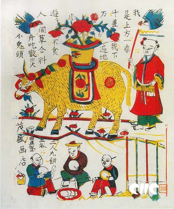 后来,耕人演变成司掌万物萌生的芒神,牛的模型或真牛均被加以彩饰,参加丰富多彩的迎春活动。北宋时,在立春的前一天,京城开封府要向皇宫进献春牛(土牛),各重要衙署也置春牛(土牛)于衙署门前,以示各级政府重视农耕。到了立春之日的凌晨,将置于皇宫及政府各衙署门前的春牛打碎,是为“打春”。市民争抢被打碎的春牛残片,抱回家中,成为祛病、宜蚕、祈求丰年的吉祥物。从那时起,迎春、打春便成为一项重要的庆祝活动,在城市、农村展开。象征吉祥的牛,被画家及民间艺人画成迎春的年画及彩塑在市面上出售,很受人们欢迎。春牛图则成为年画、剪纸、刺绣等领域常见的题材。