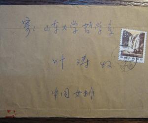 这张明信片信封正面写的收信人地址为“山东大学哲学系”。1984年的6月末,我从山东大学中文系毕业,留校参加筹建社会学系的工作。当年,山大社会学系的筹建工作是在哲学系里进行的,我们八零级留校参加筹建工作的7名应届毕业生,先是在哲学系工作,直到1986年初才独立出来,成立社会学系。当时这封内里装有明信片的信就是寄到哲学系的。
