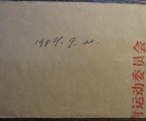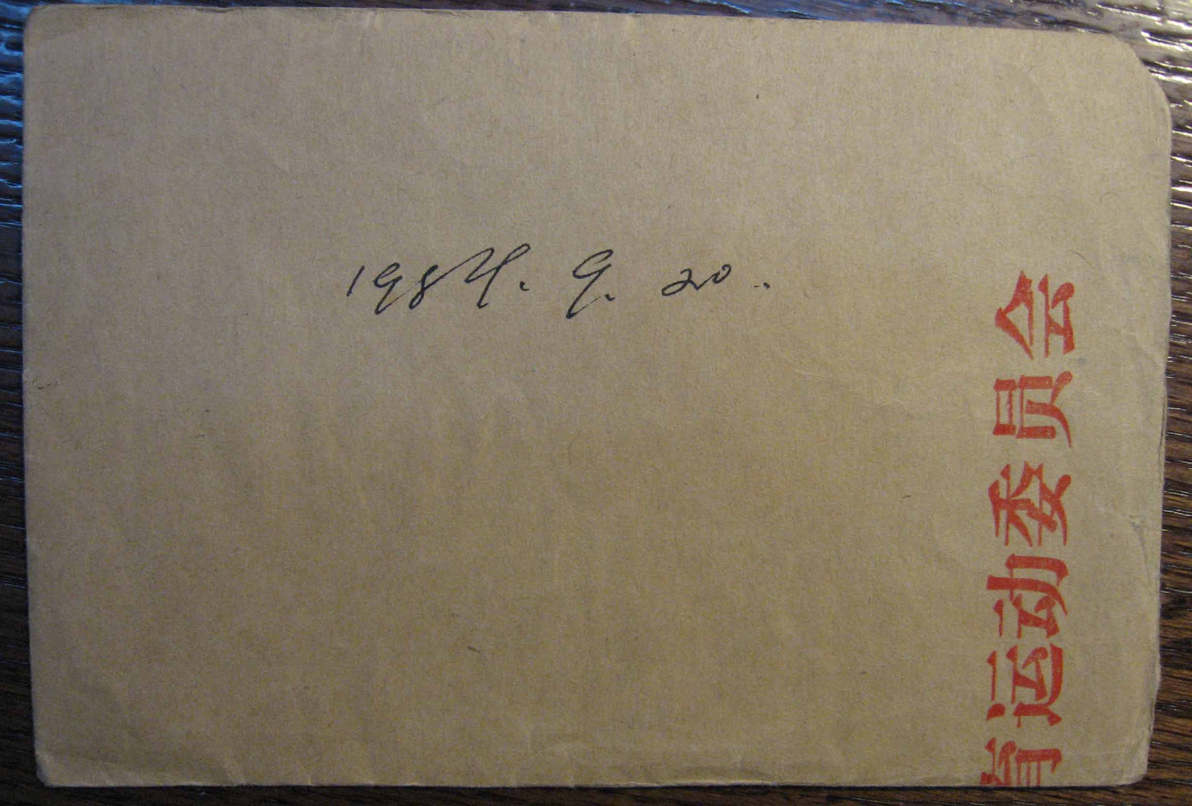 在信封的背面,有印刷体的红字“育运动委员会”的字样,这显然是“国家体育运动委员会”的后半段,说明这个信封是用已经使用过的大信封重新裁剪裱糊而成,当年是可以使用这种信封的,现在如果再用这样的信封就会被退回了。信封背面还有我自己用钢笔写的日期“1984、9、20”,这应该是我收到回信的日期。