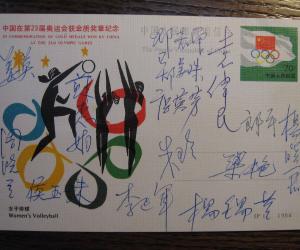 在明信片上签名的共有14个人,是当年中国女排的全体人员:两名教练和12名队员。两名教练为袁伟民和邓若增,12名队员分别是郎平、杨晓君、梁艳、杨锡兰、郑美珠、张蓉芳、朱玲、李延军、苏惠娟、侯玉珠、姜英、周晓兰。这说明中国女排当时非常重视与球迷和广大观众之间的交流,认真对待为明信片签名这类事情。这些签名中,只有郎平是用钢笔,其他人都是用的圆珠笔。记得当时自己的解释是,郎平是一个集邮爱好者,所以知道用钢笔签名更符合集邮的习惯。