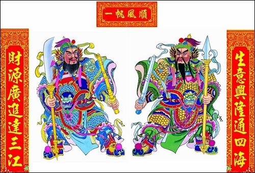 为了祈求一家的福寿康宁,一些地方的人们还保留着贴门神的习惯。据说,大门上贴上两位门神,一切妖魔鬼怪都会望而生畏。在民间,门神是正气和武力的象征,古人认为,相貌出奇的人往往具有神奇的禀性和不凡的本领。他们心地正直善良,捉鬼擒魔是他们的天性和责任,人们所仰慕的捉鬼天师钟馗,即是此种奇形怪相。所以民间的门神永远都怒目圆睁,相貌狰狞,手里拿着各种传统的武器,随时准备同敢于上门来的鬼魅战斗。由于我国民居的大门,通常都是两扇对开,所以门神总是成双成对。