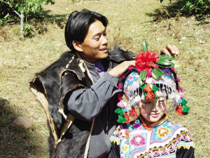 小伙儿为姑娘插上象征吉祥的马缨花。