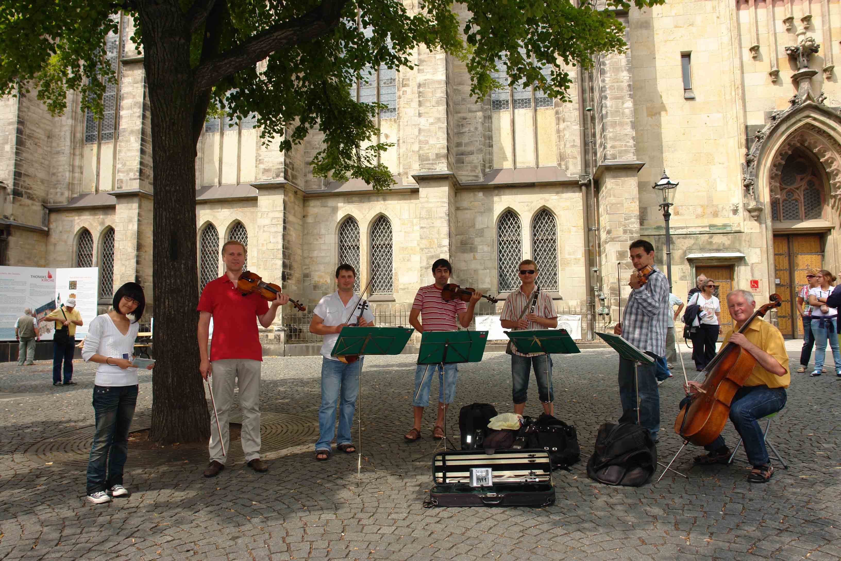 圣托马斯教堂也因为巴赫而成为时刻与音乐分不开的圣地。在我们停留圣托马斯教堂不到三个小时的时间里,在教堂南门外、巴赫塑像一侧的空地上,先是一位拉小提琴的女士独自在演奏着小提琴,当我们参观完教堂出来时,已经换成了由小提琴、中提琴和长笛组成的六人乐队在演奏。小乐队演奏的曲目几乎都是我们熟悉的名曲,其中自然也少不了巴赫的曲子。