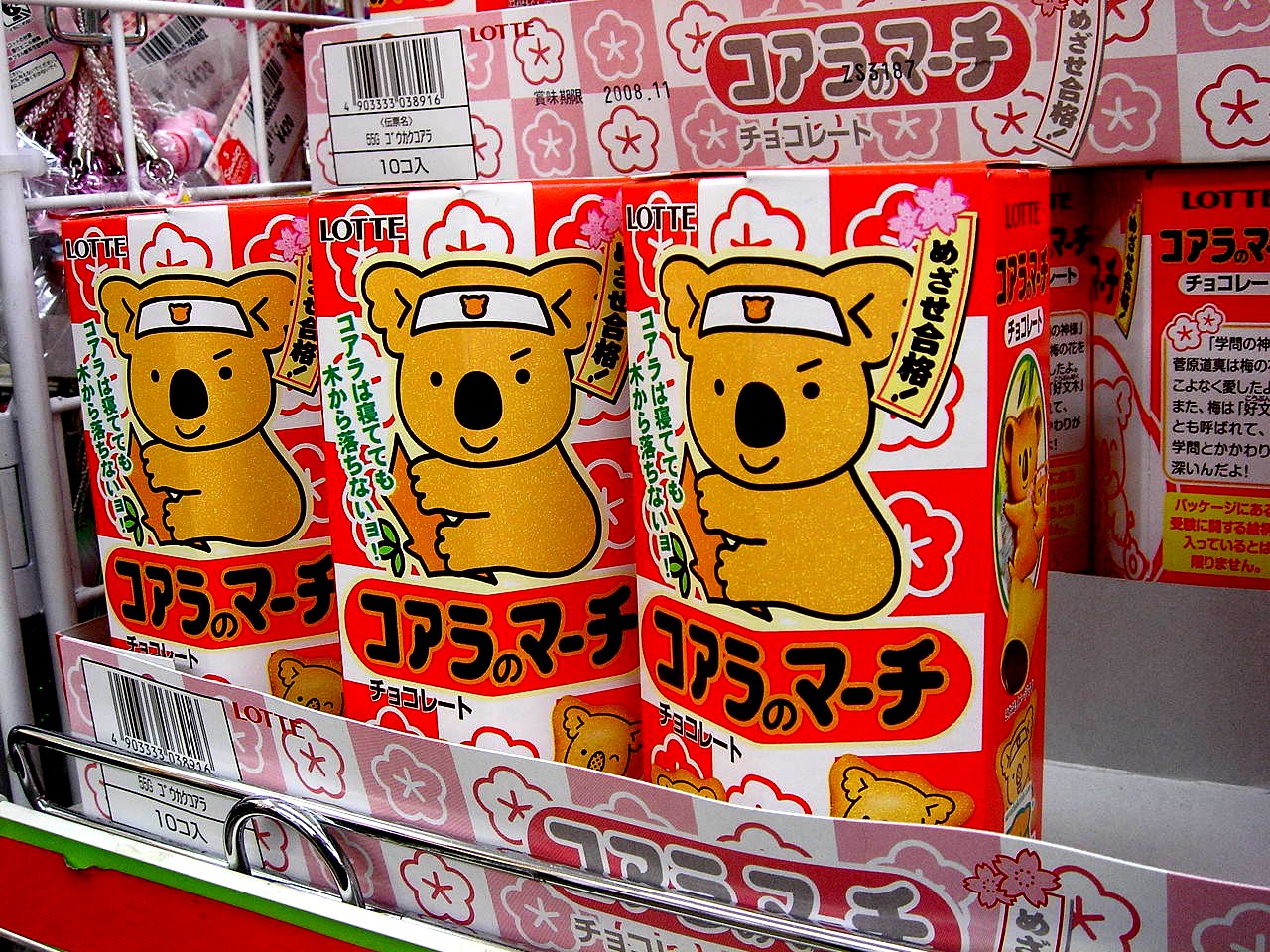 好彩头永远行销。这一款考拉饼至今仍是考生们的零食首选。不过很遗憾的是,考拉的三月饼传入中国时,改名为“小熊饼”。大概是资本主义的迷信不适合中国国情,这头“就算睡觉也不会落地”的吉祥物,跨过日本海,一下就从神圣跌落凡间,难怪一般中国学生都不知道小熊饼在日本考试信仰中的重要地位呢。