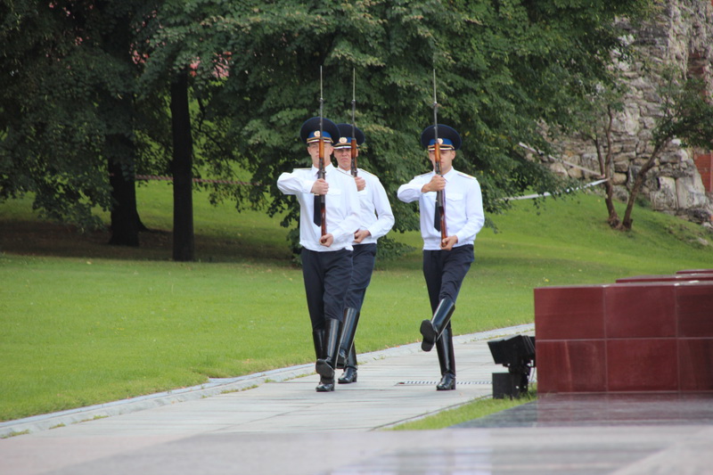 我们先在朱可夫元帅的雕像前驻足,然后来到位于亚历山大花园的无名烈士墓前,等待观看每到整点举行的卫兵换岗。作为国家礼仪的一个象征性地点,无名烈士墓所纪念的只是二战时期苏联卫国战争牺牲的烈士们,在仪式功能上和我们的人民英雄纪念碑作用相同,我们经常能够从电视镜头上看到的,就是外国领导人到墓前敬献花篮,对先烈表示敬意。