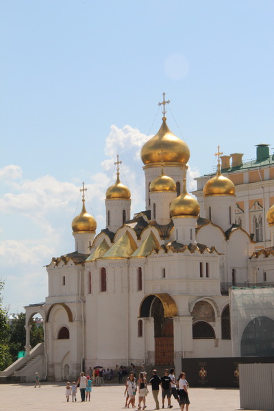 没来克里姆林宫之前,以为克里姆林宫就是一座宫殿,实际上,克里姆林宫是由诸多教堂、博物馆、大会堂、总统府等国家最高办公机构组成。克里姆林宫对游客开放的部分有限,我们参观了三座教堂:圣母升天大教堂是俄罗斯历代沙皇举行加冕仪式的地方,圣母领报大教堂是沙皇及其家族成员举行祈祷等宗教仪式的地方,天使长教堂则是俄罗斯历代统治者(俄罗斯大公和沙皇们)死后灵柩安葬的地方。武器库是一座展示12至19世纪俄国历代统治者权力象征、对外关系及其奢华生活的博物馆,是克里姆林宫里最值得参观的地方,从里面所收藏的沙皇服饰、皇冠、权杖、器皿,尤其是彼得大帝和叶卡捷琳娜女皇使用过的服饰等物品,可以窥见俄罗斯皇室的富有,可见想象当年俄罗斯统治者日常生活的奢华场景。装饰繁复、样式各异的沙皇使用过的车辆,有的是外国皇室或首领所送,从中也部分反映了俄罗斯帝国的外交关系。馆内还展示有各式枪械、金银为主的各种马具装饰。与红场、列宁墓到处可见中国人的情形不同,武器库内的参观者中国人不多,这大概与单独售票有关(武器库的参观门票折合人民币220多元,旅行社一般不安排参观)。