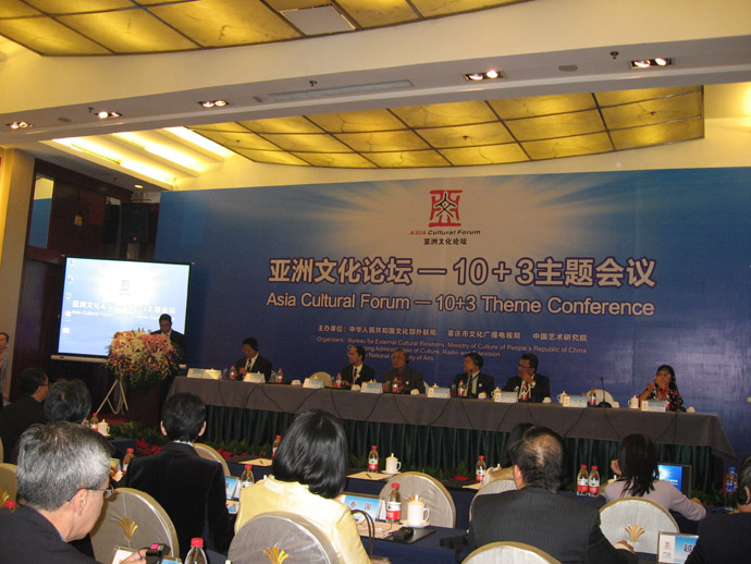 由文化部外联局、重庆市文化广播电视局、中国艺术研究院主办的“亚洲文化论坛——10+3主题会议”于10月9—12日在重庆召开。论坛的总议题是:亚洲的文化艺术多样性与和谐发展。分议题为:(1)亚洲文化机构的交流合作与亚洲文化的可持续发展;(2)亚太地区的非物质文化遗产保护与亚洲文化的可持续发展;(3)重庆宣言。应邀到会的有东盟10国和中日韩三国的学者和文化官员。