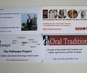 国内外的学者和机构分别介绍了各自所做的资料与研究网络平台的建设情况。美国弗里教授的演讲给人留下的印象特别深,他带来了印制精美的四张名片大小的卡片,上面分别是口头传统中心四个不同网络平台的网址,弗里教授介绍一个情况,就给大家分发一张卡片,希望大家记住并使用其网络资源。口头中心的杂志创办25年,在杂志的网络平台上,可以检索全部刊发文章,并且可以使用多种检索方式,比如可以检索到25年来所刊发的有关中国口头传统研究的40余篇文章。弗里教授他们的网络还专门设计了中文版,以期方便中国学者使用。听弗里教授的介绍,给人的感觉是,他们唯恐你不使用、或不会使用他们的资料,他们愿意提供一切使用资源的便利条件。