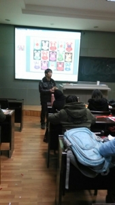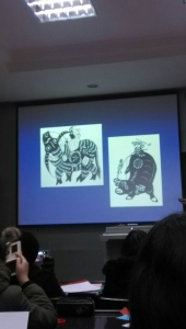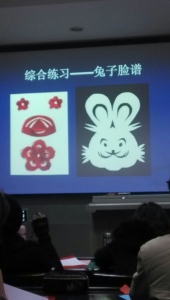 黎老师首先介绍了中国重要的剪纸大师,并教授了“十二生肖”的剪法。她说,“剪纸不仅代表的是一种艺术,更是一种态度,许多艺术家们朴素却又热爱生活,在贫苦的陕北,窗花不仅仅是一种装饰,更是底层大众的生活态度”,当讲到她的导师何红一教授时,我们感受到了她对何老师的崇敬之情,“何老师60岁了,依然每天坚持去学院学习研究,她是一个极其认真的人,我有次看到她去学院的背影时,感动的偷偷哭了”,“学剪纸需要耐心与热情,基本功很重要,不仅要会剪,还要会画,何老师当年在文革时天天剪‘为人民服务’的大字,她告诉我那段时间的艰苦锻炼其实锻炼了她扎实的刀工”。