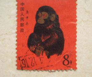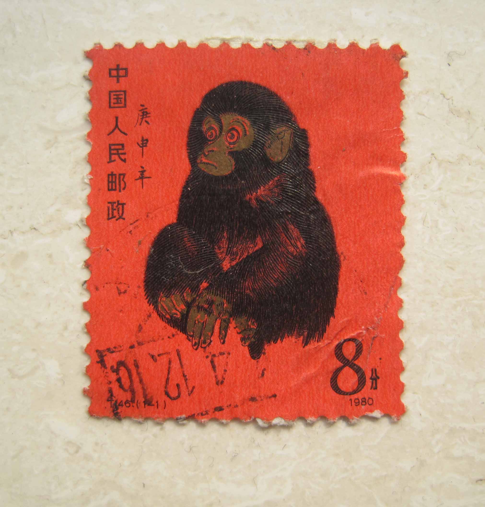 我这张1980年发行的猴票,是盖销票,品相尚可。我印象中,这张猴票是从同学来信的信封上揭下来的,而且已经是1981年的事情了,当时人们还是把这张猴票当做普通邮票使用,并没有料想到它后来的巨大增值。如今收藏第一轮生肖票的,大多缺少这一张猴票。