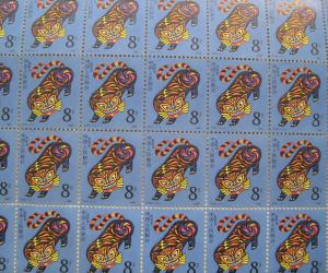最遗憾的是我原来有一整版1986年发行的虎票,不知怎么弄的,大概是为了给朋友吧,竟然从整版上面拆出了三个方联,成为破损版票了。1984年工作后,手中有了一点钱,到1986年的时候便买了一版虎票。可能也是那一年的虎票发行较多吧,否则像我这种纯粹是业余玩票的主儿,也不会买到生肖版票的。