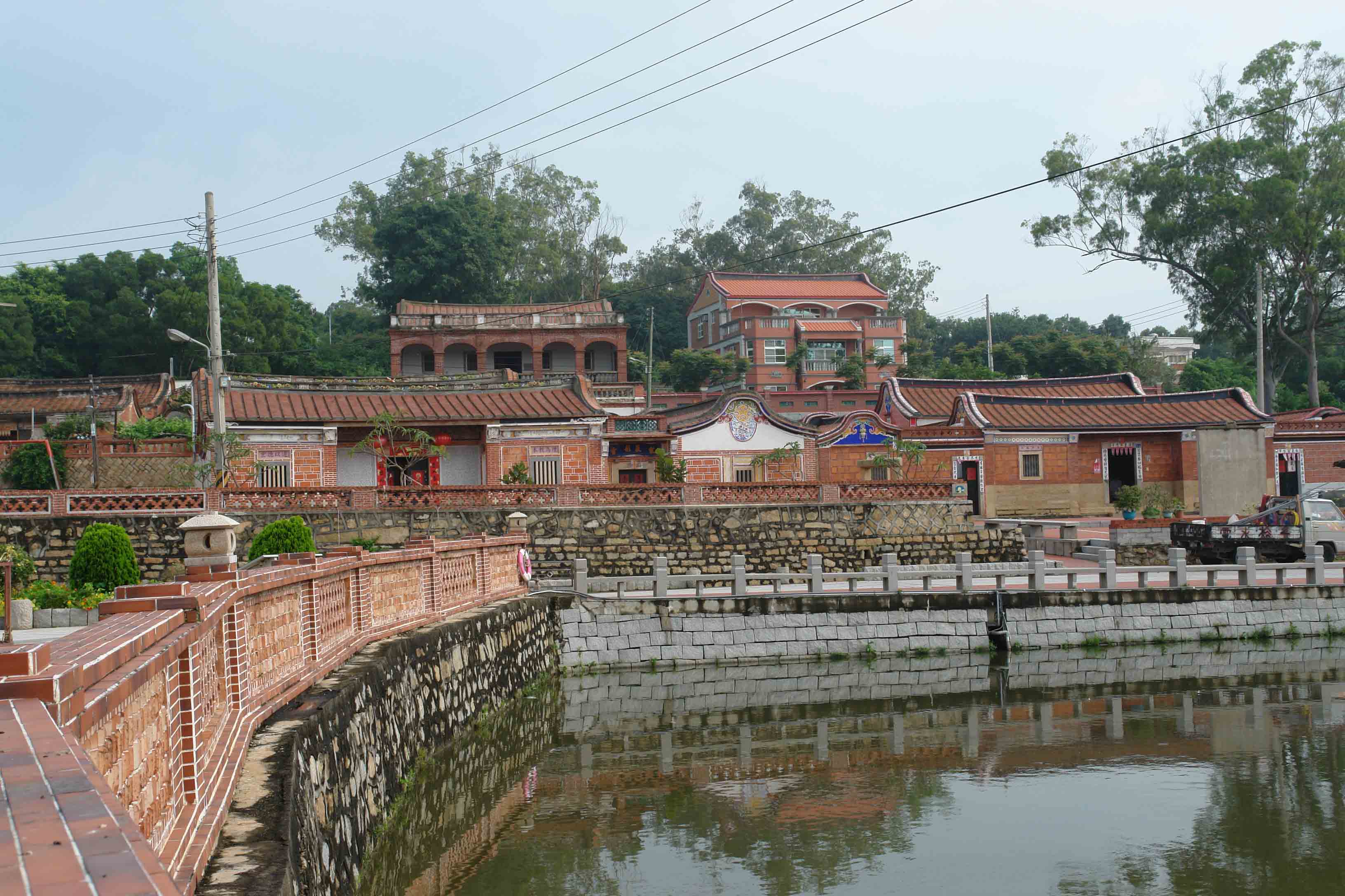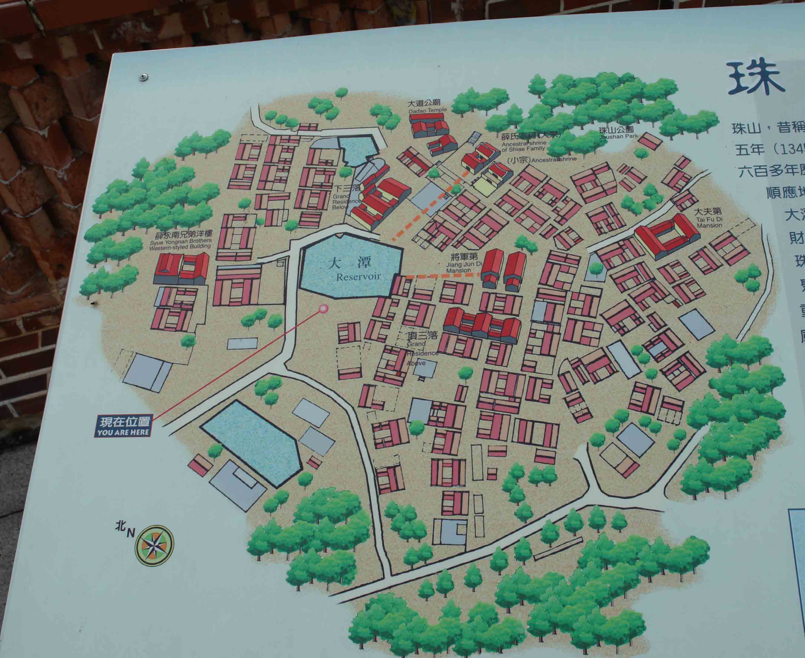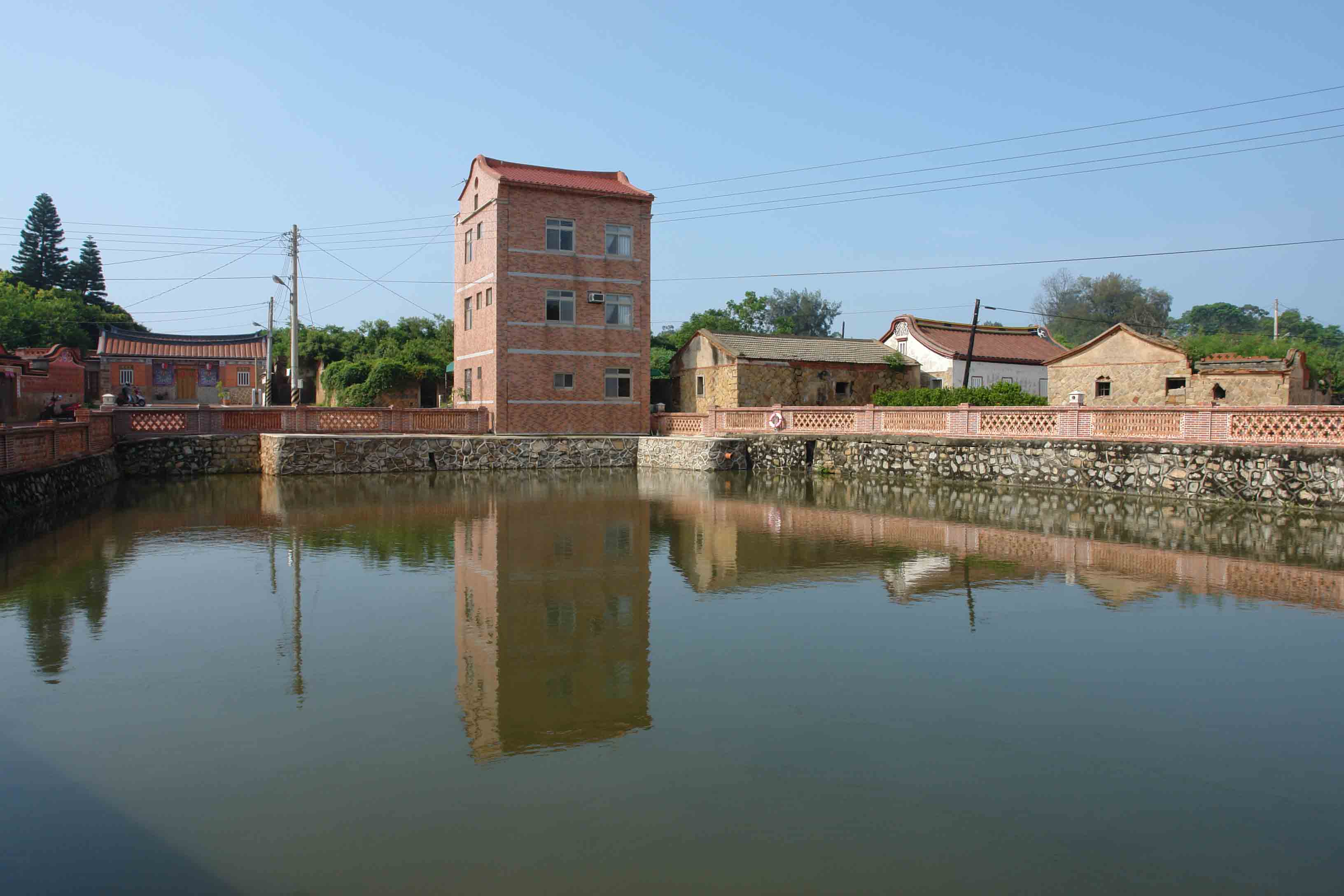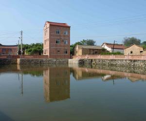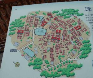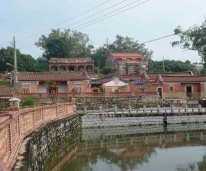 在金门当地,多将村庄称作“聚落”。珠山聚落在建筑风水方面颇为讲究。聚落顺应地形地势,环绕内聚凹地,所有建筑共同朝向聚落中心的“大潭”,风水上称作“四水归潭穴”,有聚水生财之意。自东北往西南,聚落入口、大潭、大宗宗祠、珠山山峦构成一条清晰的轴线,形成珠山聚落珍贵的历史景观。