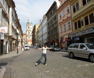 女儿在布拉格老街上撒欢