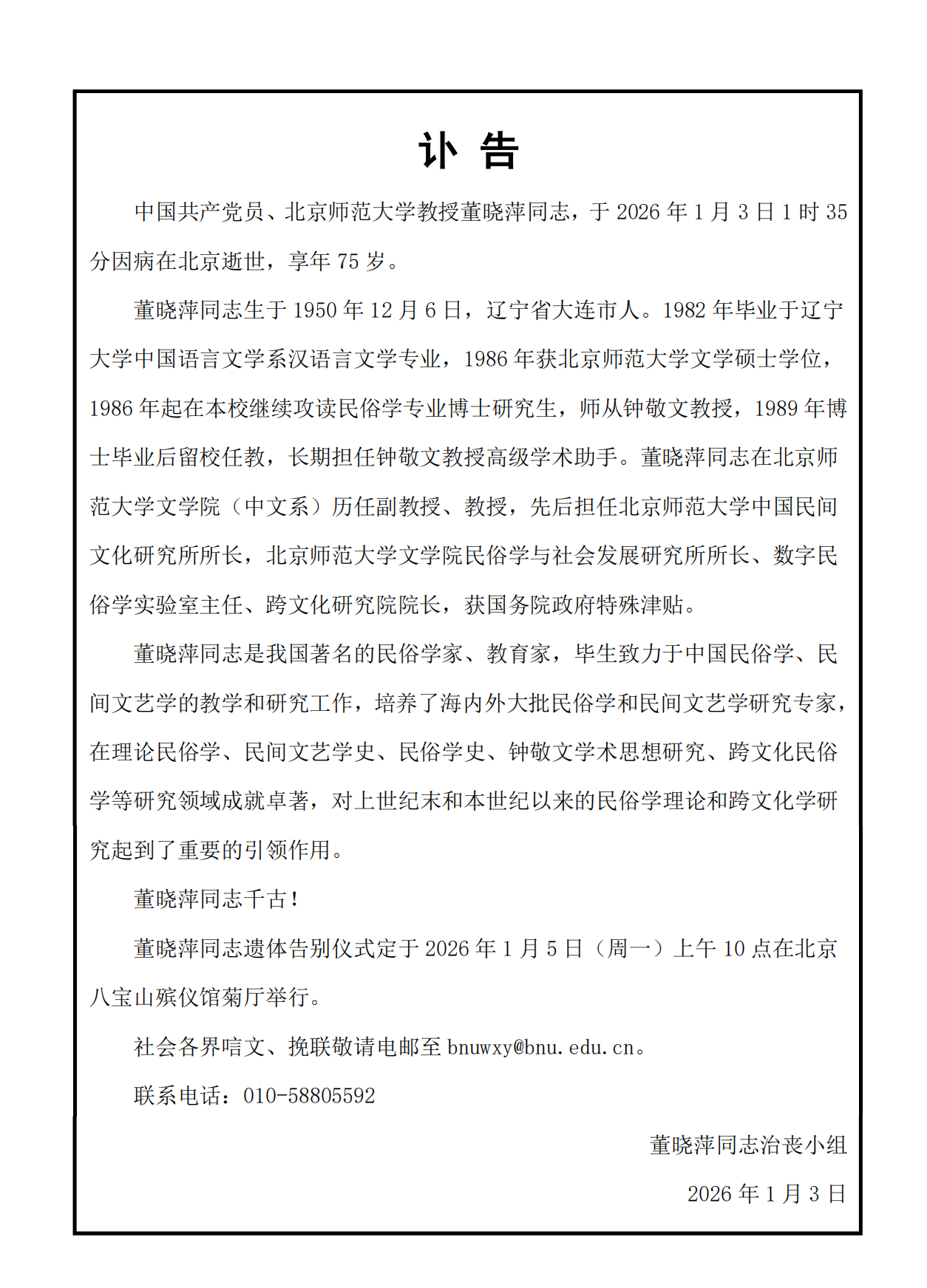 讣告:董晓萍教授辞世